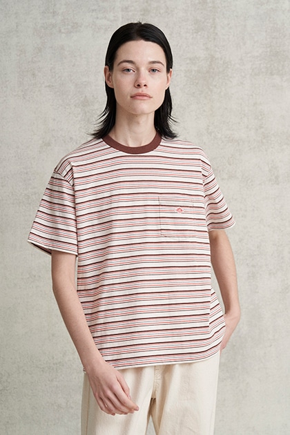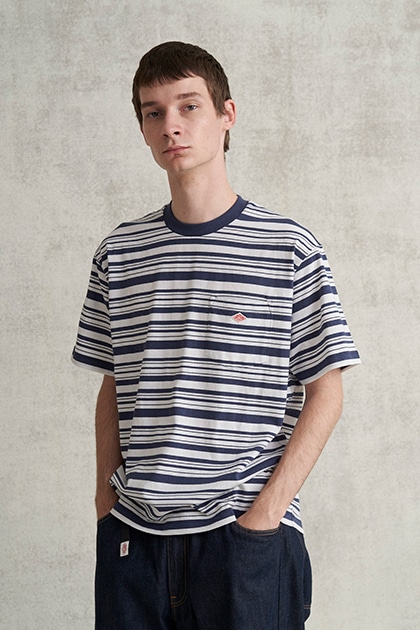 一枚着るだけで存在感を放つ、マルチボーダー柄のポケットTシャツ。ネック部分のカラーが全体の印象を引き締めます。