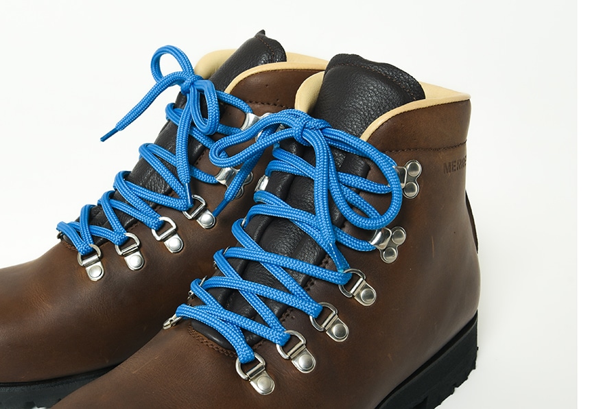 メレルのトレードマークである鮮やかなブルーのシューレースが、ブランドのアイデンティティを演出します。