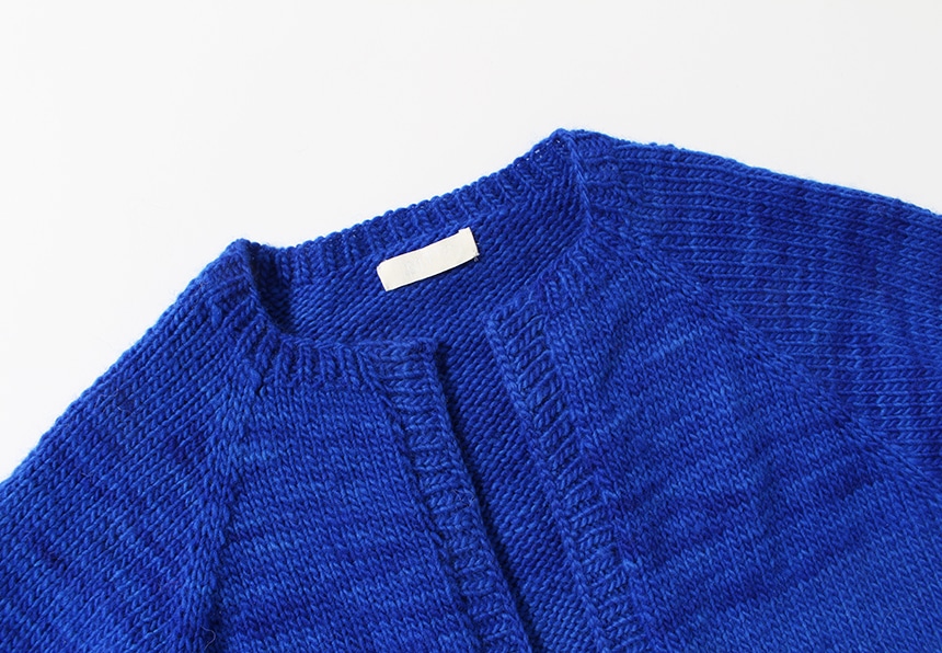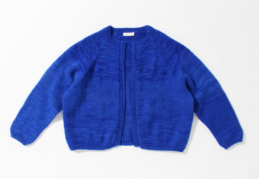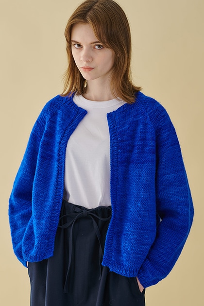 鮮やかなブルーが爽やかなボタンレスカーディガン。