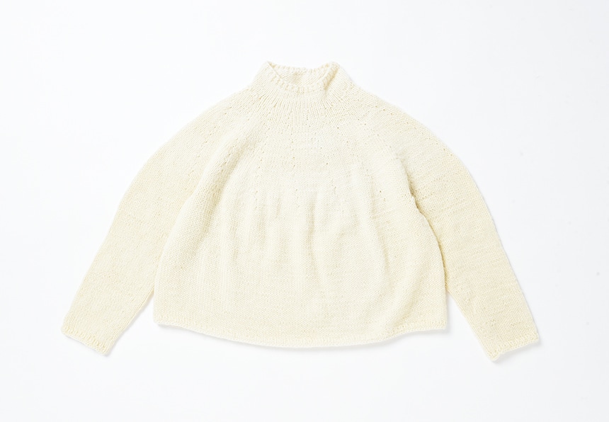 ホワイトのワントーンカラーに、サーキュラーヨークのデザインが映えるモックネックニット。