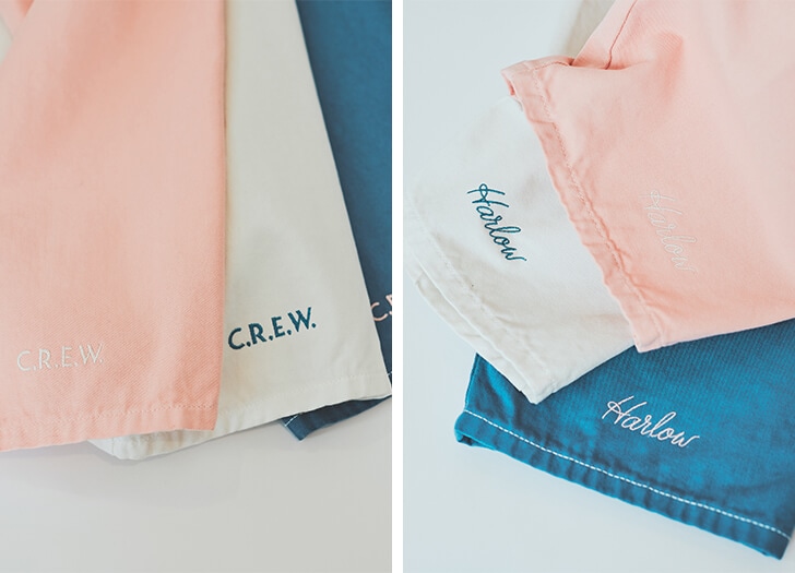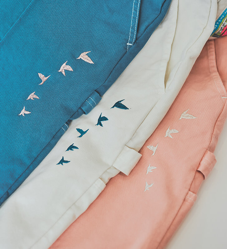 後ろの両裾にはHarlowのロゴと“C.R.E.W”の刺繍を配置。さらに前腿には、店主の“平和を願う鳥のタトゥー”から着想を得た繊細な刺繍がさりげなく添えられています。