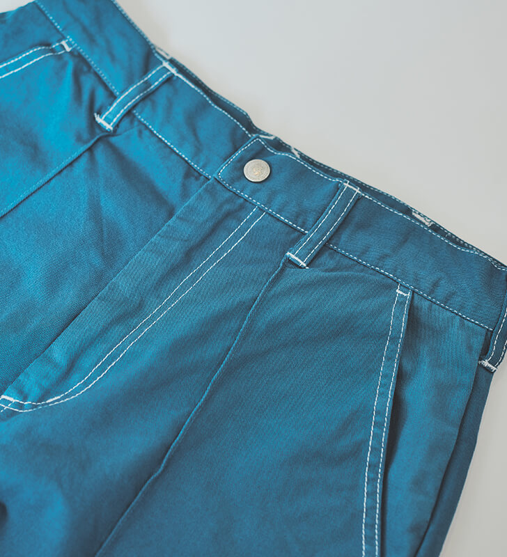 見た目のアクセントにもなっているフロントのピンタックは、固定で施されたセンタープレス風仕様。ワークウェアに“きちんと感”と“清潔さ”を加えるデザインとして機能しています。