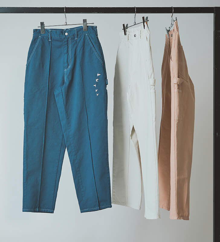 SMITH’Sの定番「Les Halles ペインターパンツ」をベースに、Harlowのブランドカラーの3色を表現した特別な1本。製品染めにより、クラフト感と洗練が共存する仕上がりに。