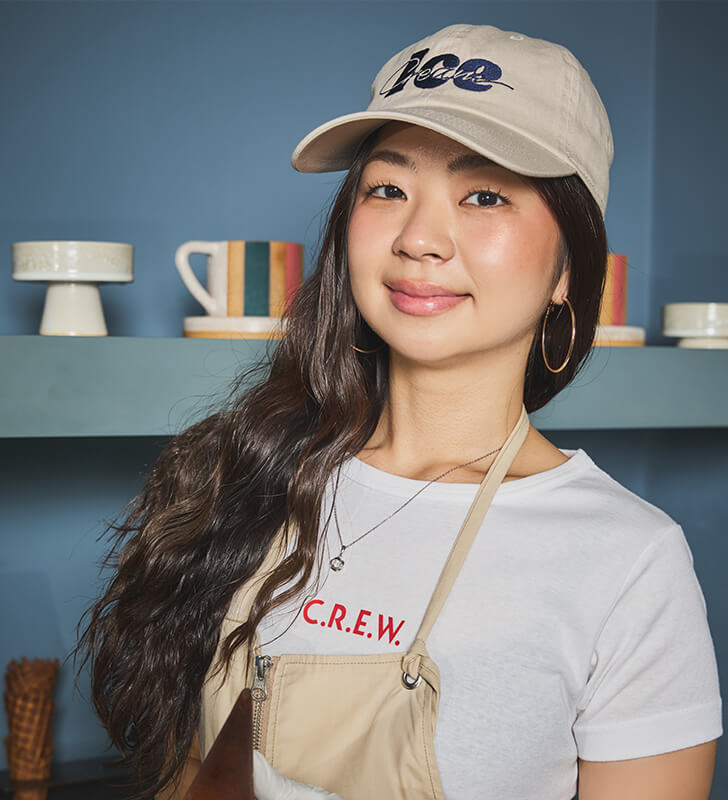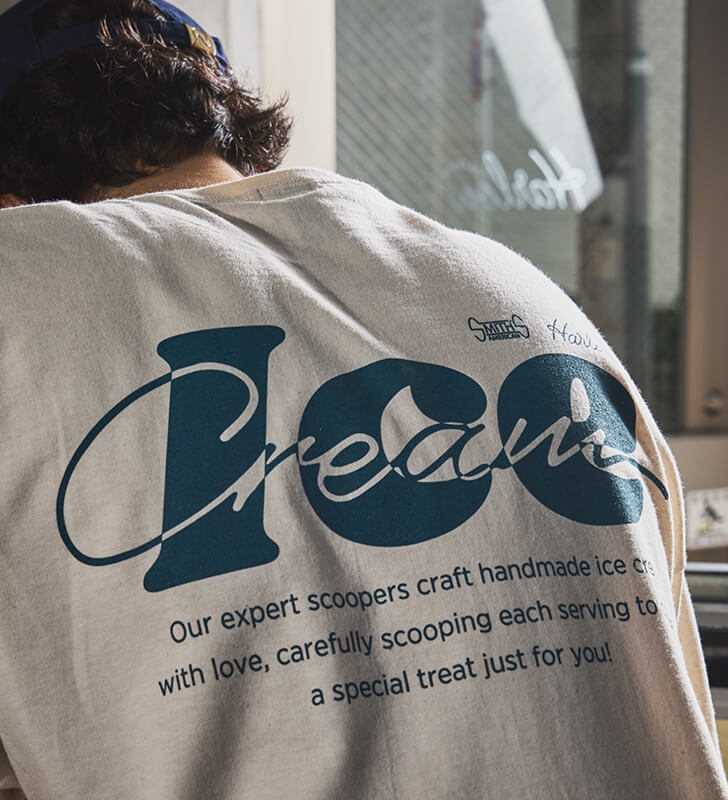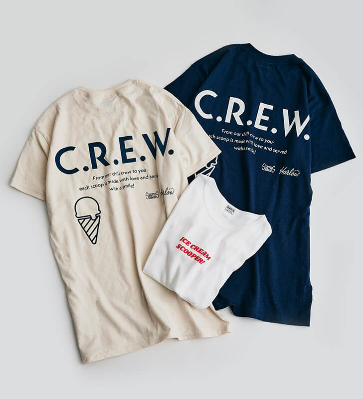 “CREW”と“ICE CREAM SCOOPER”のグラフィックを、前後に刺繍とプリントでデザイン。