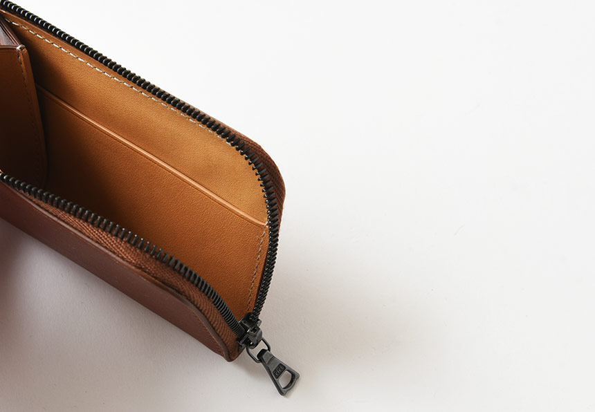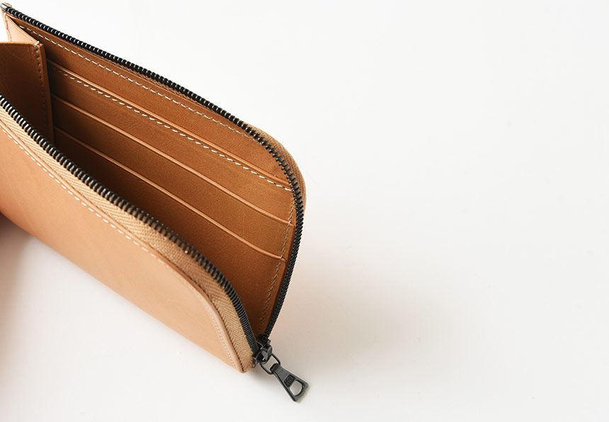 開閉のしやすいジップタイプは内側には紙のように薄い、滑らかな肌触りの革を使用しております。